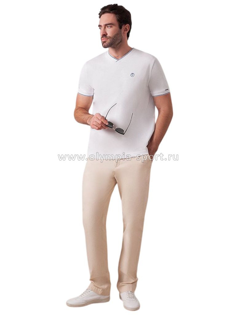Футболка белого цвета с аккуратным V-образным вырезом выполнена из премиального хлопка с эластаном плотностью 200 Г/м2. Высококачественный эластичный хлопок обеспечивает мягкость, воздухопроницаемость и идеальную посадку на любую фигуру и размеры, включая 58 размер. Классический прямой крой футболки подчеркивает фигуру, но не сковывает движений. Элегантный небольшой V-образный вырез с контрастной полосой визуально удлиняет шею, а минималистичная вышивка на груди в виде логотипа бренда добавляет изысканности и индивидуальности, не перегружая образ. Эта базовая футболка - идеальный баланс комфорта и стиля для современного мужчины, легко сочетается с разными низами, создавая образ от кэжуал до более элегантного. Стильная футболка подходит как для повседневной носки, так и для создания более нарядных образов.